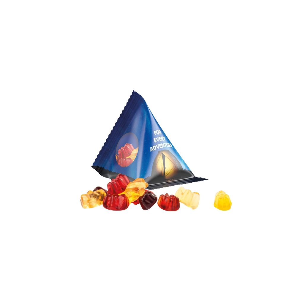 Artikel-Nr: PUC1027.00015Trolli Gummibärchen im Tetraeder aus transparenter Folie, individuell bedruckt. Inhalt: Trolli Gummibärchen in Fruchtsaftqualität Exquisit mit 30 % Fruchtsaftanteil, bunt gemischt, 15 g