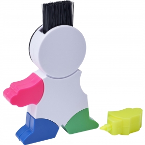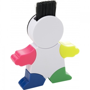 Artikel-Nr: GIV8535002Textmarker 'Brush' in Figur-Form aus Kunststoff mit vier Farben: gelb, pink, grün und blau. Inkl. eines Bildschirmreinigers auf der Rückseite und einem Tastaturreiniger am Kopf.