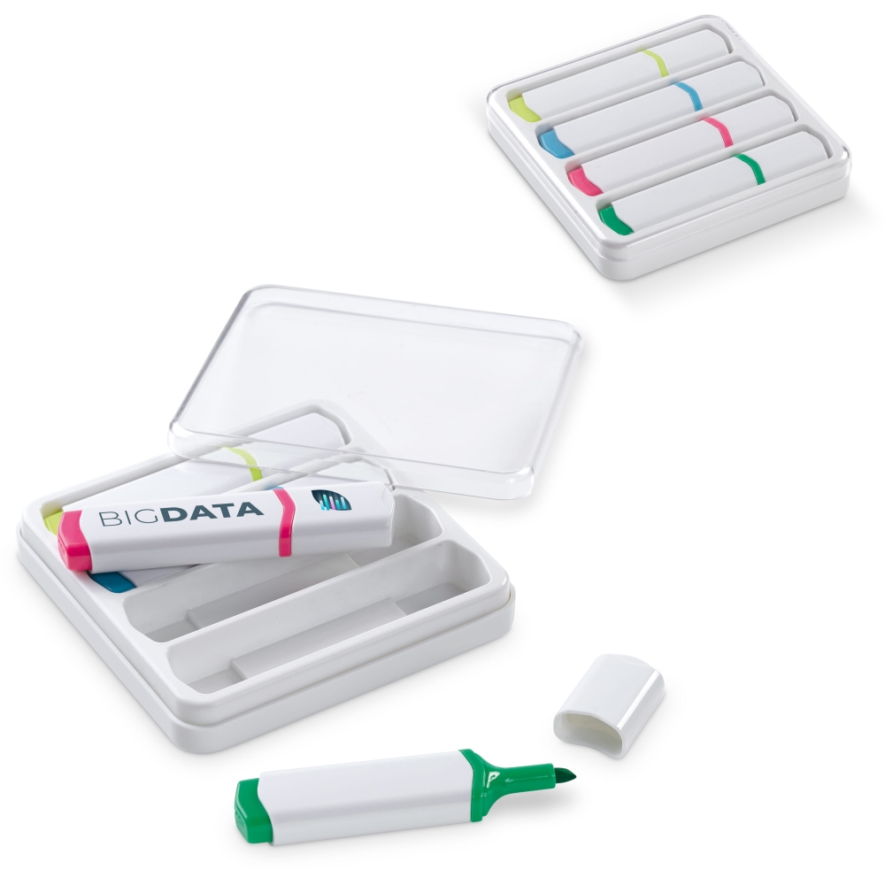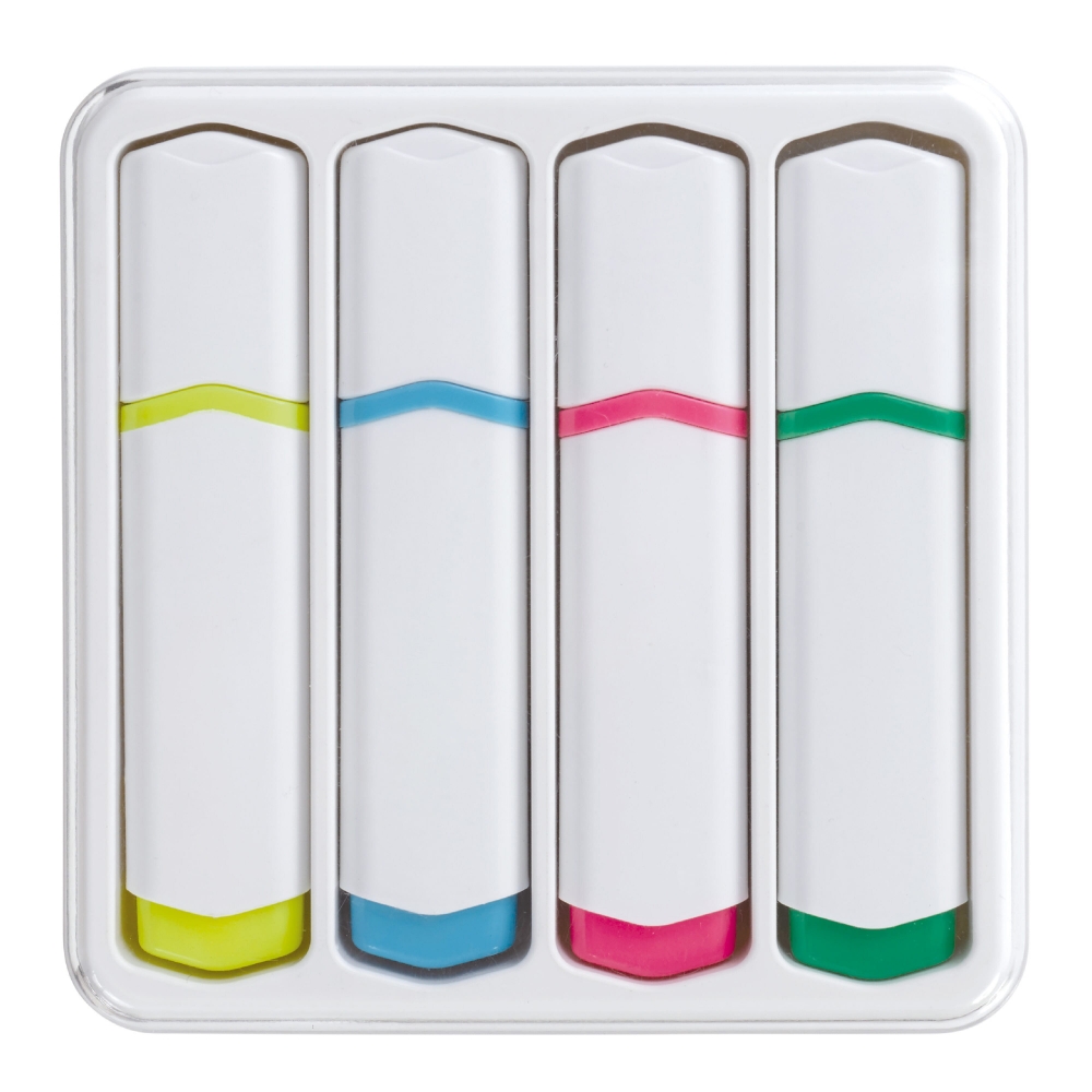 Artikel-Nr: ART81293N0001Set mit 4 Basis Textmarkern in einer geeigneten Kunststoffbox mit transparentem Deckel. Die Textmarker sind in einem einzigartigen Toppoint Design. Die farbigen Details am Textmarker zeigen die Schreibfarbe.