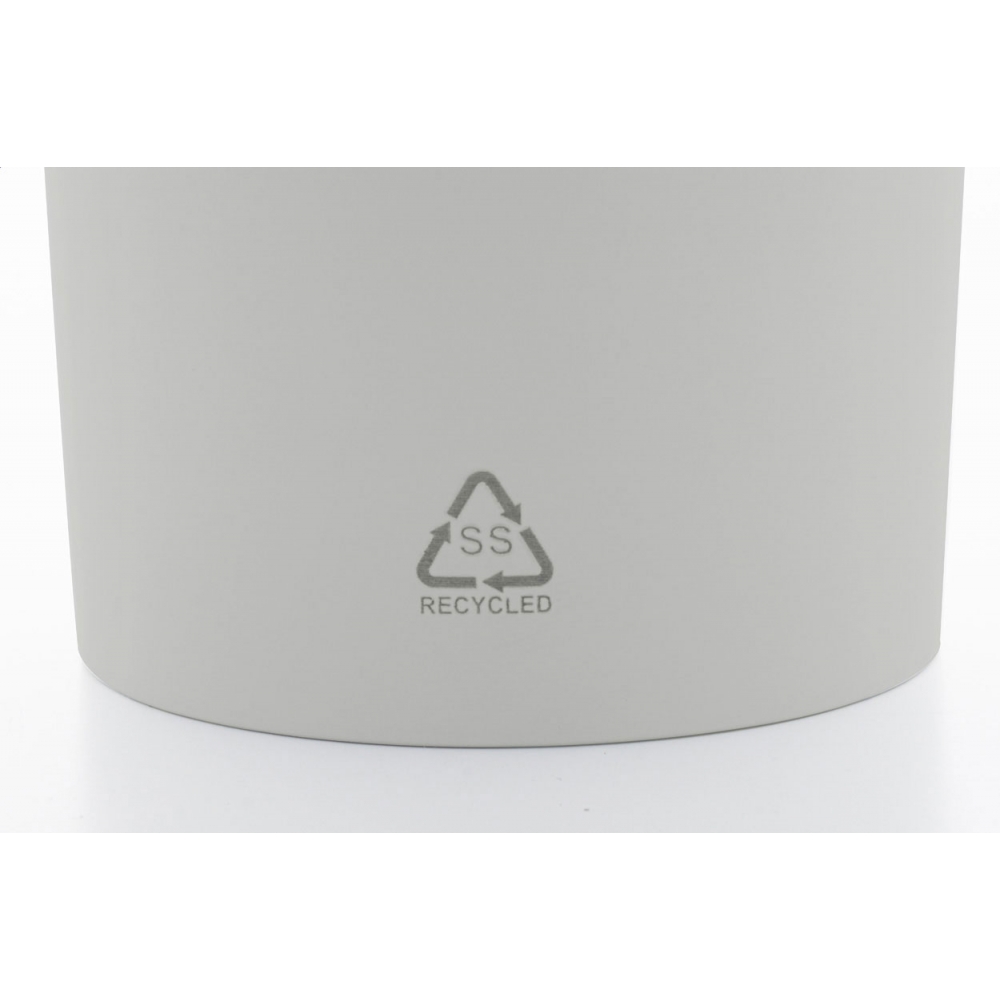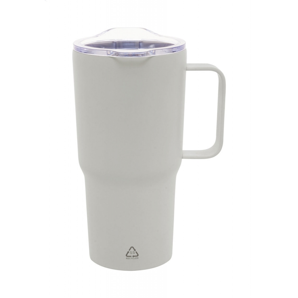 Artikel-Nr: AND808147-77Doppelwandiger, vakuumisoloierter Thermobecher aus recyceltem Edelstahl mit Trinkdeckel aus PS Kunststoff. Füllmenge: 600 ml.