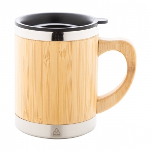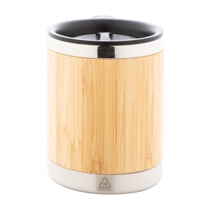 Artikel-Nr: AND808225Isolierbecher aus recyceltem Edelstahl mit Bambusüberzug, Bambusgriff und PP-Trinkdeckel, doppelwandig. Füllmenge: 300 ml.