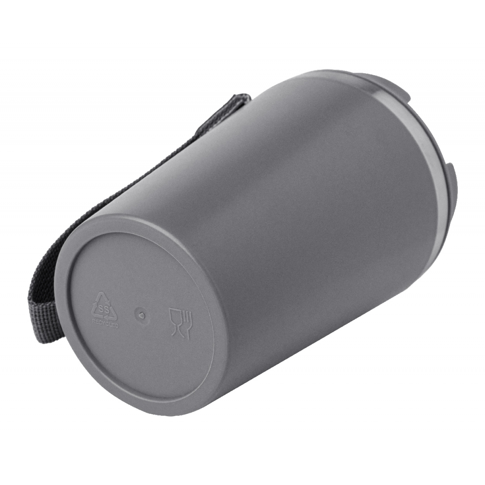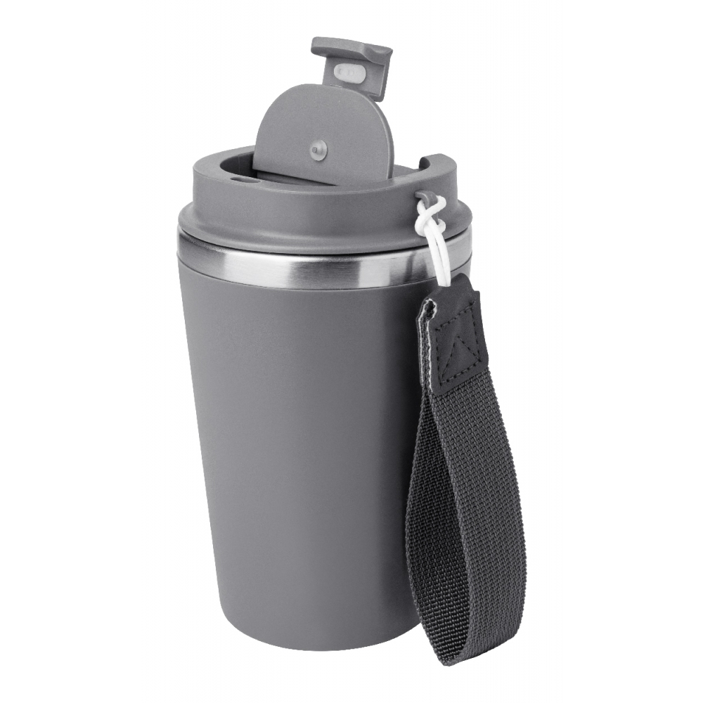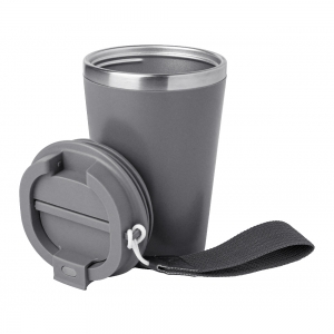 Artikel-Nr: AND800587-77Doppelwandiger, Isolierbecher aus recyceltem Edelstahl mit PP-Kunststoffaußenseite und Trinkdeckel. Mit RPET-Griffschlaufe. Füllmenge: 350 ml.