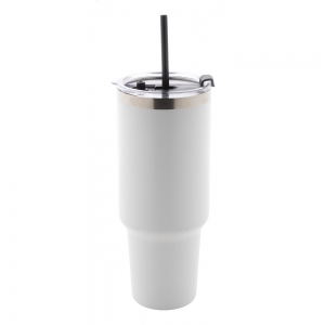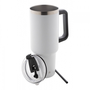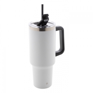 Artikel-Nr: AND808165-01Doppelwandiger, vakuumisolierter Thermobecher aus recyceltem Edelstahl mit PS-Trinkdeckel und PP-Strohhalm. Füllmenge: 1200 ml.