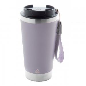 Artikel-Nr: AND808119-13Doppelwandiger Thermobecher aus recyceltem Edelstahl mit Trinkdeckel aus PP Kunststoff und farblich abgestimmter Trageschlaufe. Füllmenge: 430 ml.