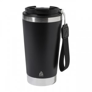 Artikel-Nr: AND808119-10Doppelwandiger Thermobecher aus recyceltem Edelstahl mit Trinkdeckel aus PP Kunststoff und farblich abgestimmter Trageschlaufe. Füllmenge: 430 ml.