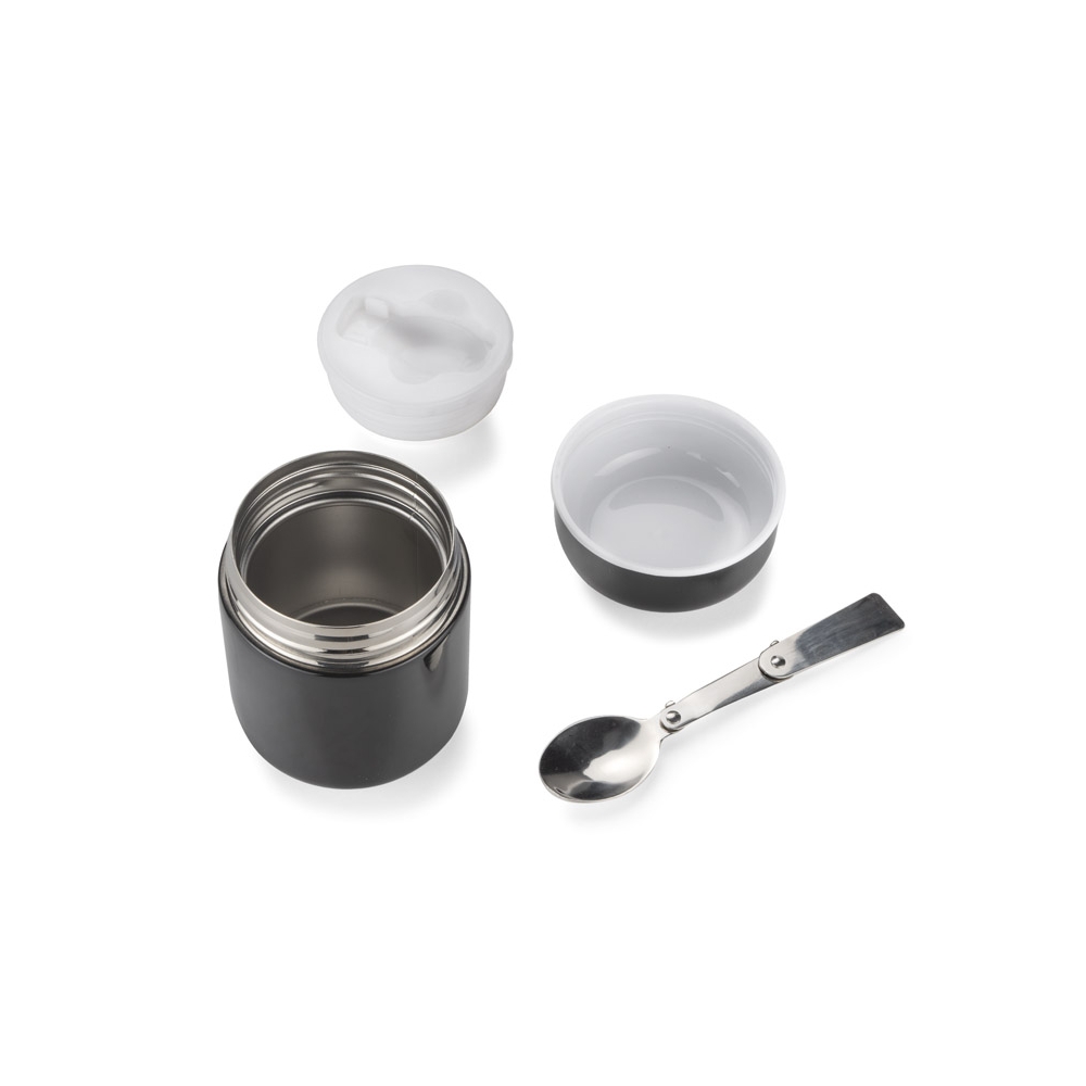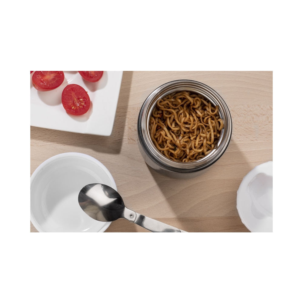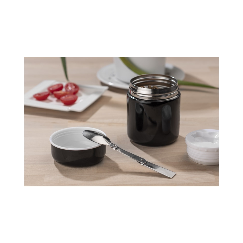 Artikel-Nr: ARD16531-02Der Thermobehälter DINA vereint die Funktion einer Thermoskanne und eines Lebensmittelbehälters. Wir können den kleinen Behälter überall hin mitnehmen und ein warmes Mittagessen auf der Arbeit oder in der Schule genießen. Der Einfachheit halber befindet sich in der Kappe ein klappbarer Edelstahllöffel. Dank Vakuumisolierung wird die Temperatur bis zu 8 Stunden gehalten. Das Innere des Behälters ist aus hochwertigem Edelstahl gefertigt.