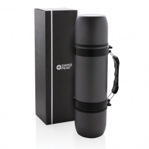 Artikel-Nr: XND433330Doppelwandige Stainless-Steel Thermosflasche in elegantem Design mit Griff und Schultergurt sowie 2 passenden Tassen. Auslaufsicher, nur Handwäsche. Inhalt: 700ml.