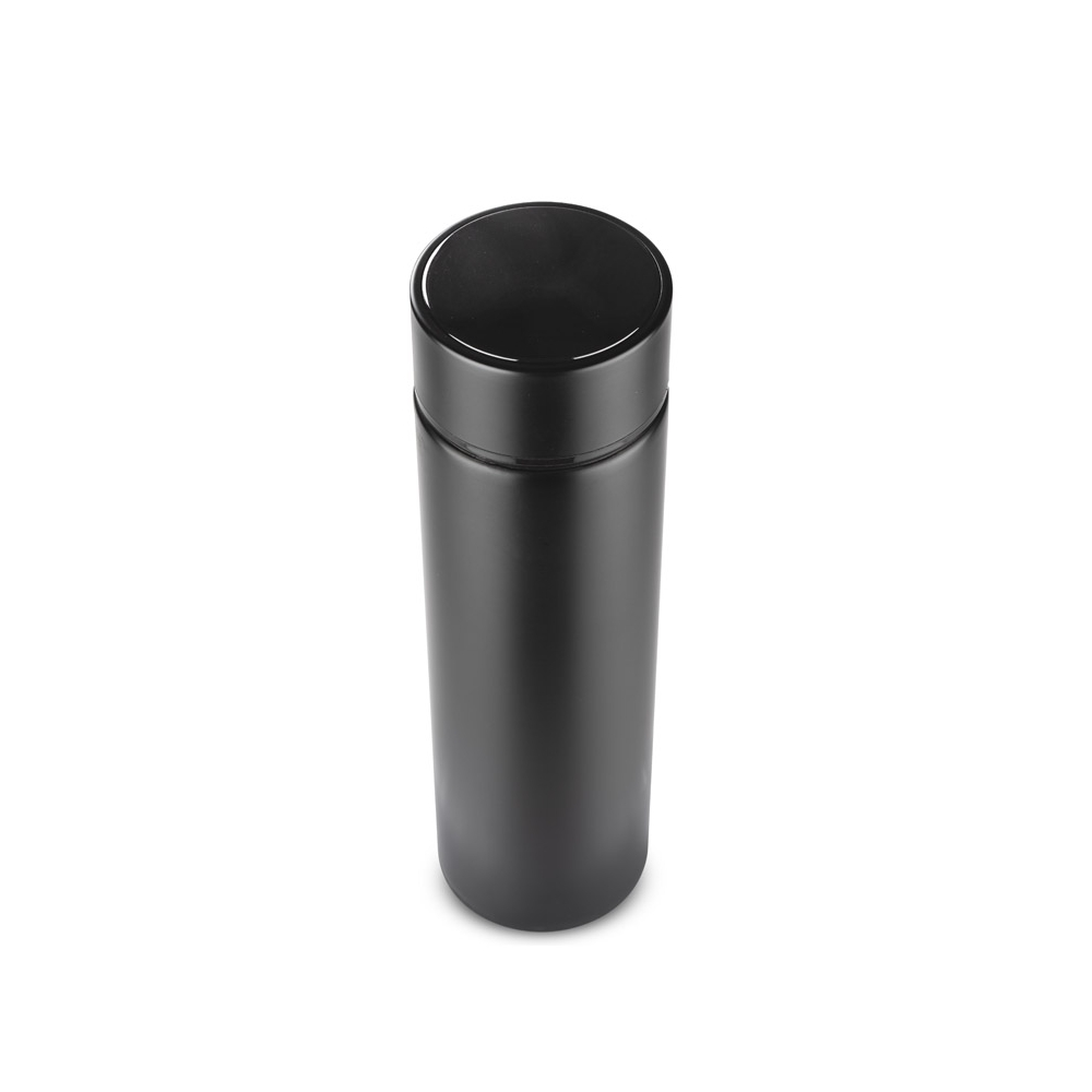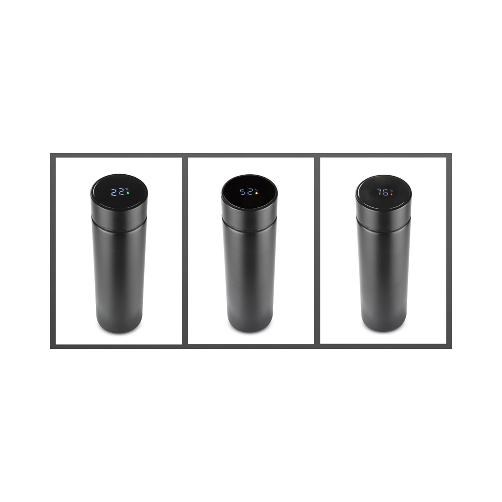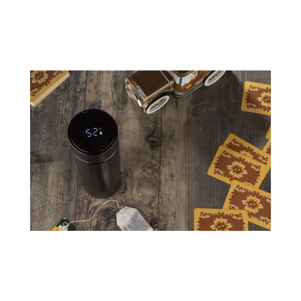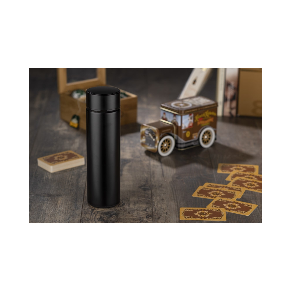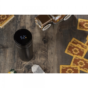 Artikel-Nr: ARD16014-02Die Thermoflasche THERMO ist ein sehr interessantes Gadget. Es kombiniert die klassische Funktion einer Thermoskanne und Elektronik in Form eines in die Kappe eingebauten Digitalthermometer. Drehen Sie die Flasche einfach 10 Sekunden lang um, um die Temperatur des Getränks abzulesen. Zusätzlich wird ein Tropfensymbol angezeigt, dessen Farbe sich je nach Temperatur ändert: rot, wenn das Getränk heiß ist, gelb, wenn es trinkbar ist, und grün, wenn es kalt ist. Dank des Vakuums zwischen den Wänden hält es die Temperatur etwa 13 Stunden lang. Hergestellt aus Edelstahl 304. Im Inneren befindet sich ein Sieb, dank dem wir Tee brauen können.