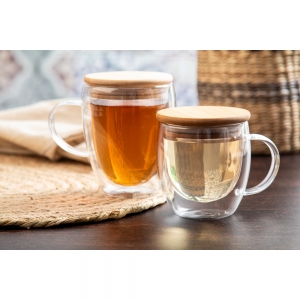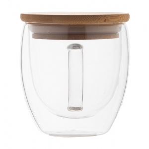 Artikel-Nr: AND800566Doppelwandige Thermotasse aus Borosilikat mit Henkel und Bambus-Deckel. Füllmenge: 250 ml. Einzeln in Kraftpapierbox.