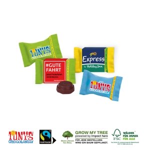 Artikel-Nr: CDL91503Schwer zu widerstehen! Fairtrade®-Schokolade von Tony's ist 100 % frei von moderner Sklaverei, hergestellt mit 100 % rückverfolgbaren Bohnen, palmölfrei und umweltfreundlich verpackt in Papier. Als Büroproviant, als Messesnack oder als kleine Freude zwischendurch.