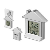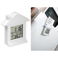 Tischuhr aus Kunststoff mit Magnet und Notizenhalter. Funktionen: Uhr, Regime 12/24, Wäcker, Countdown, Thermometer. Inkl. Knopfbatterie (1x).