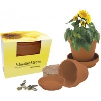 Inhalt: Maxi Natur-Set mit Tontopf Ø 90 x Höhe 80 mm, Untersetzer, Erdtabletten und Samen: Zwersonnenblume