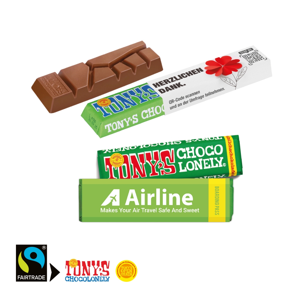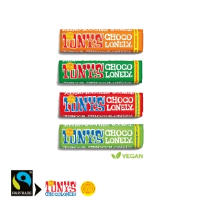 Inhalt: 1 Tony's Riegel (ca. 47 g). Geschmacksrichtungen Vollmilch, Vollmilch Karamell Meersalz, Zartbitter Mandel Meersalz (vegan), Vollmilch Haselnuss.