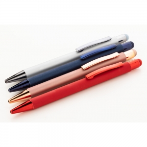 Artikel-Nr: AND808188-97Kugelschreiber mit Touchpen aus recyceltem Aluminium mit Softouch Oberflächeund farbigen, metallisch glänzenden Teilen, mit Spezialbeschichtung für Spiegelavuren passend zu den Metallteilen, blauschreibend.