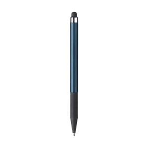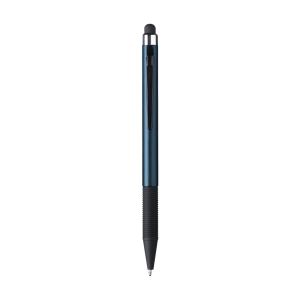 Artikel-Nr: CLP199632Blauschreibender, leichter Kugelschreiber mit Oberteil zum Bedienen von Touchscreens (wie iPhone / iPad). Schlankes Gehäuse in Metalloptik mit Clip als Druckknopf und griffigem Gummivorderteil.