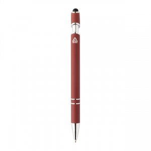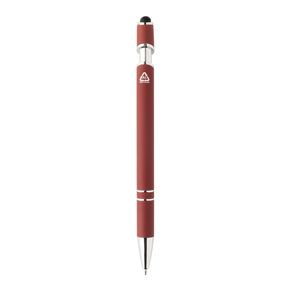 Artikel-Nr: AND800148-84Kugelschreiber aus recyceltem Aluminium mit Stylus, gummiertem Gehäuse und Chromdetails, blauschreibend.