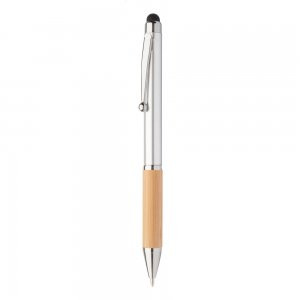 Artikel-Nr: AND806984-21Dreh-Kugelschreiber / Touchpen mit Bambus-Griffzone, Schaft mit Metallic-Oberfläche und glänzenden Chrom-Elementen. Blauschreibend.