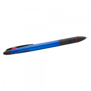 Artikel-Nr: AND809443-06Kunststoff-Kugelschreiber mit Touchpen, Gummi-Griffzone, matter Metallic-Oberfläche und drei unterschiedlichen Minen (schwarz, blau und rot).