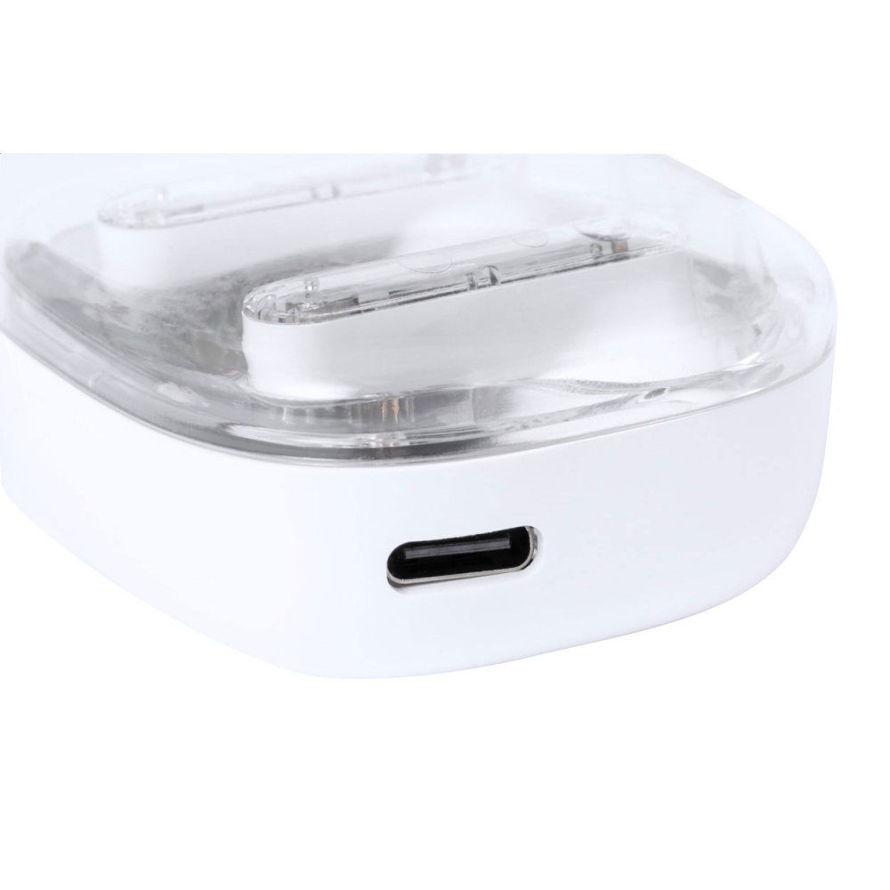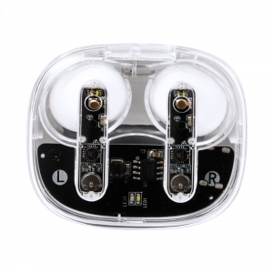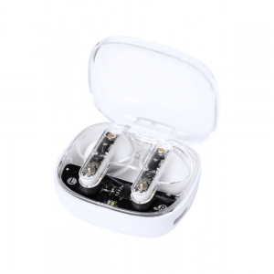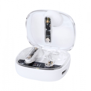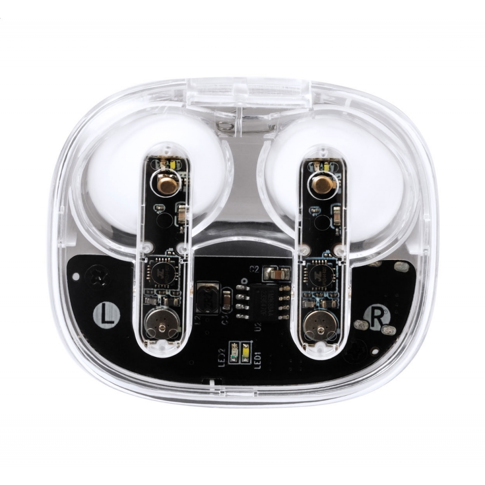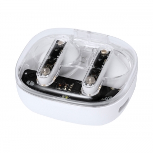 Artikel-Nr: AND733372-01Semi-transparente, kabellose Stereo-Ohrhörer (TWS) mit sichtbaren elektronischen Komponenten und Freisprechfunktion. In halbtransparentem Kunststoff-Ladeetui. Inklusive USB-Ladekabel.