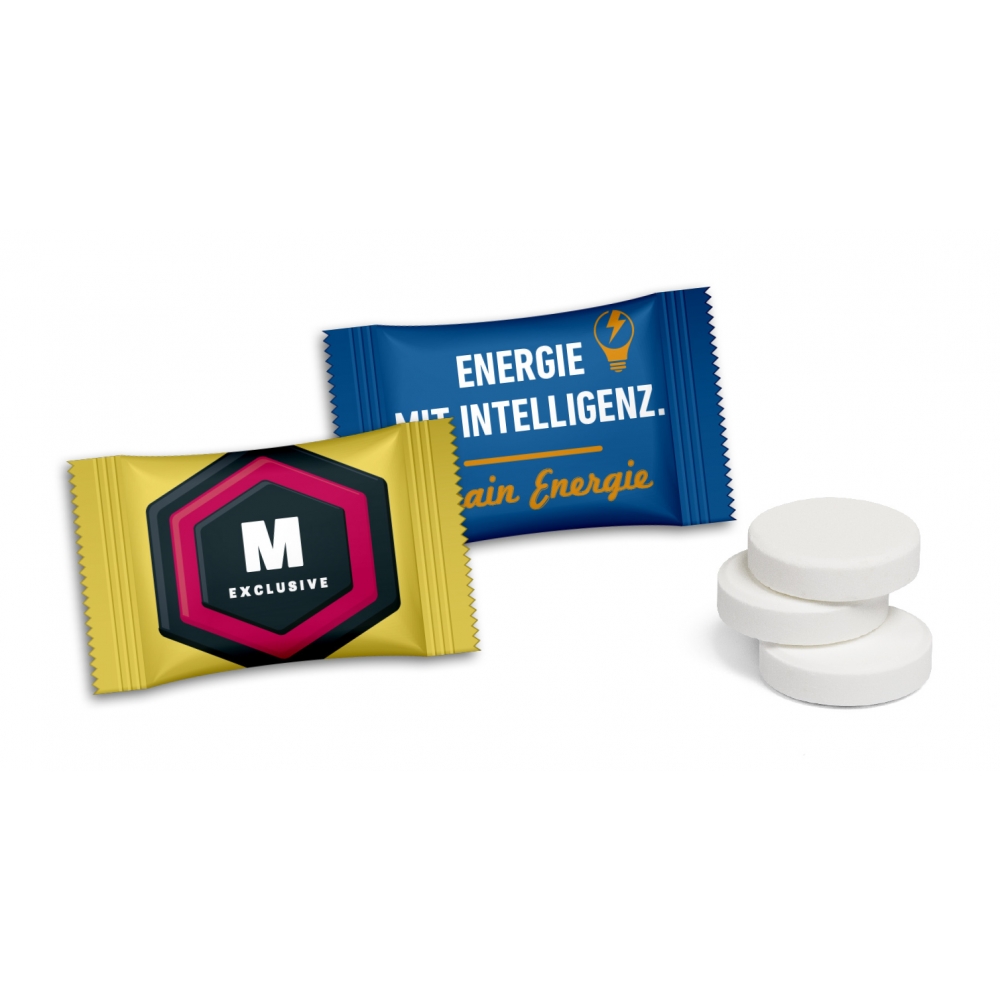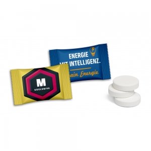 Artikel-Nr: MGN02009-0014Ob Traubenzucker in Tablettenform für den schnellen Energieschub oder eine Pfefferminztablette für frischen Atem – einzeln verpackt im individuell bedruckbaren Flowpack wird daraus ein praktisches Give-away mit süßer oder erfrischender Werbewirkung.