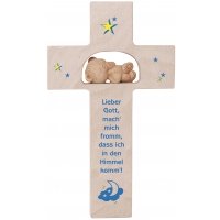 Artikel-Nr: 375109211Kreuz aus Buchenholz mit Traumbär aus Ton. Drei Gebetsmotive sortiert: Behüt' die Kinder in der Welt, behüt' die Tiere auf dem Feld! Behüt' sie alle, Groß und Klein, und lassæ sie ruhig schlafen ein! Lieber Gott, machæ mich fromm, dass ich in den Himmel kommæ! Herr Jesus, schütze unser Haus mit Vater, Mutter, Katzæ und Maus, auch auf den Teddy gib gut acht, damit er keine Dummheit macht!