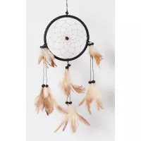 Artikel-Nr: 375101967Dekoratives Windspiel / Wandbehang für drinnen, das nach Überlieferung der amerikanischen Ureinwohner, über das Bett gehängt, schlechte Träume weg- und schöne herbeizaubert. Aus Leder mit echten Federn. Verschiedene Farben sortiert.