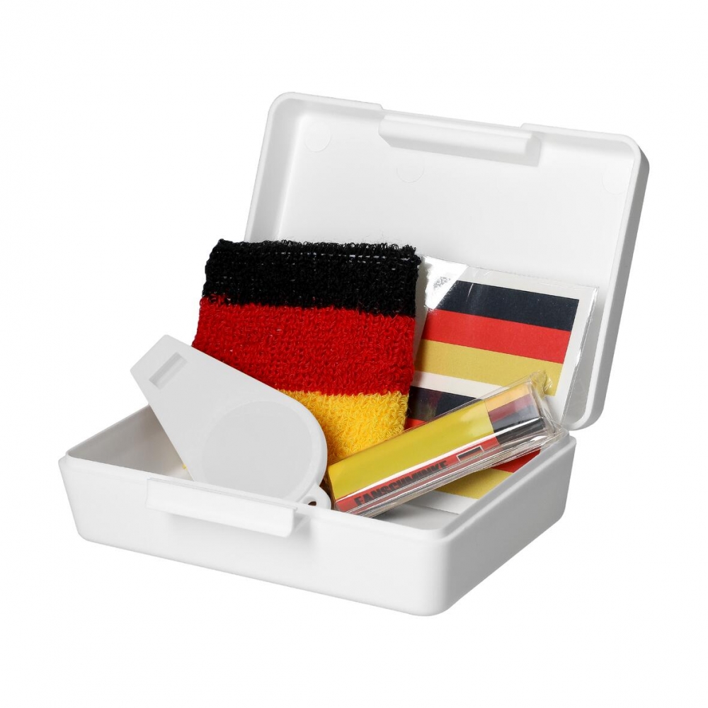 Artikel-Nr: ELT08519000-00000Rechteckige, praktische Box aus Kunststoff mit Klickverschluss, der sich auch ganz leicht mit einer Hand öffnen lässt. Befüllt mit der Pfeife "Schlüsselanhänger" (03635), einer Fanschminke (07270), dem Schweißband "Nations-Germany" (07459) und Tattoo "Nations" (09373).