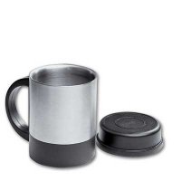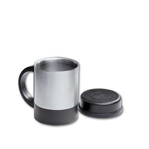 Doppelwandiger Isolierbecher mit Kunststoffdeckel. Maße: 12 x Ø 8 cm, Werbefläche: 45 x 45 mm. 30 x 40 mm, Material: Edelstahl 18/8 / Kunststoff