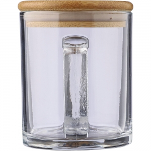 Artikel-Nr: GIV1171291021Trinkbecher aus recyceltem Glas (300 ml), hergestellt aus Natriumkalzium, mit einem Deckel aus Bambus, der als Untersetzer verwendet werden kann. Einzeln verpackt in einer braunen Pappschachtel.