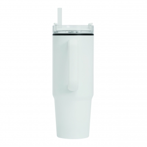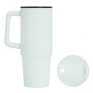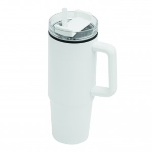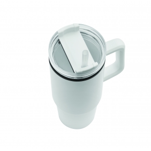 Artikel-Nr: INP56-0304688Trinkbecher DRINK ULTY, doppelwandig: innen aus Kunststoff und außen aus Edelstahl, mit praktischem Griff, transparenter Kunststoff-Deckel mit sicherem Schraubverschluss, Silikon-Dichtring, Trinköffnung mit Drehverschluss und transparentem Strohhalm, beschichteter Boden für gute Oberflächenhaftung, Füllmenge ca. 900 ml, hält ca. 2 Stunden warm und bis zu 4 Stunden kalt, in Box