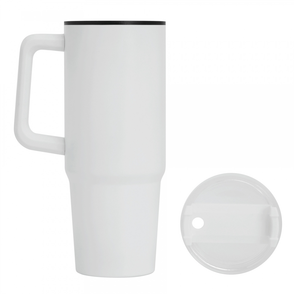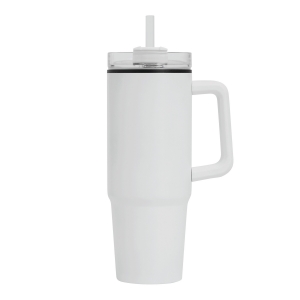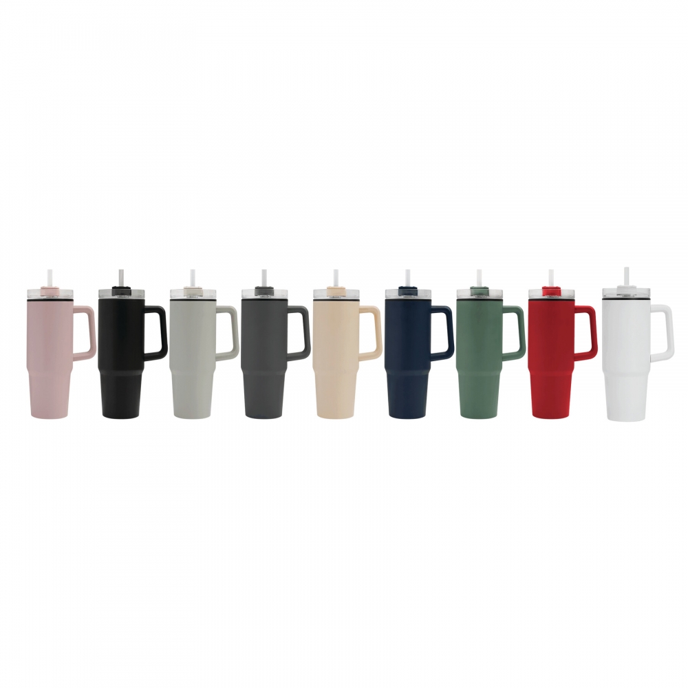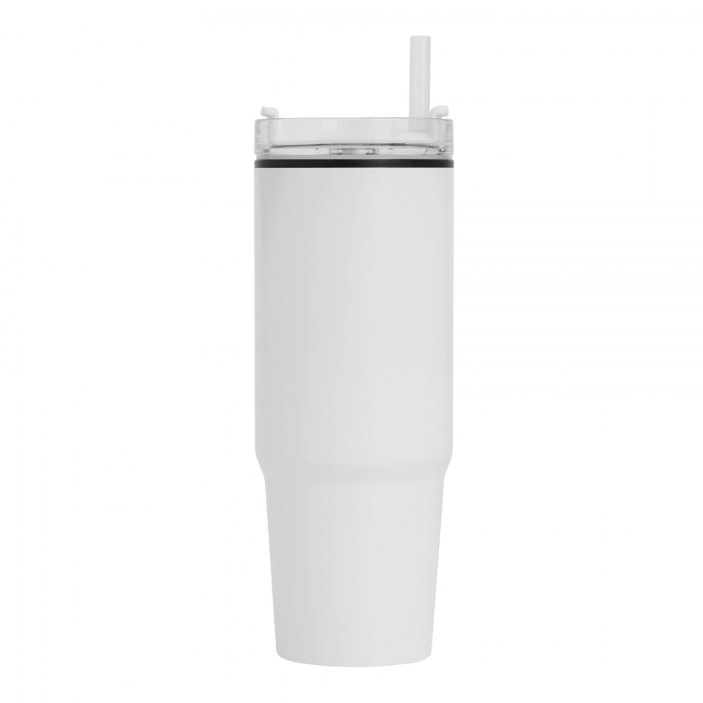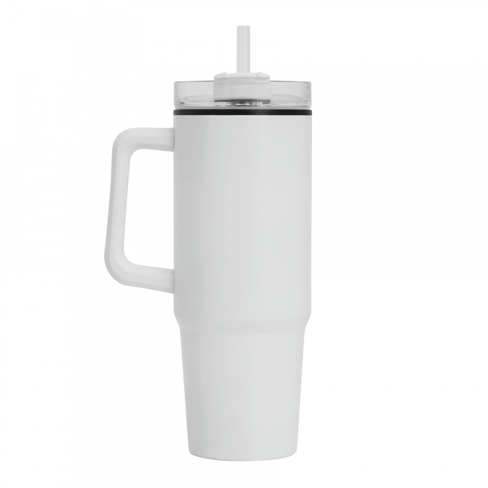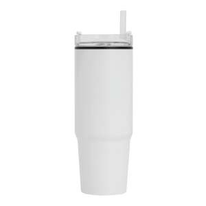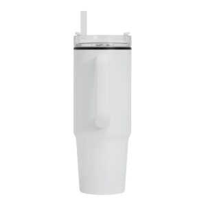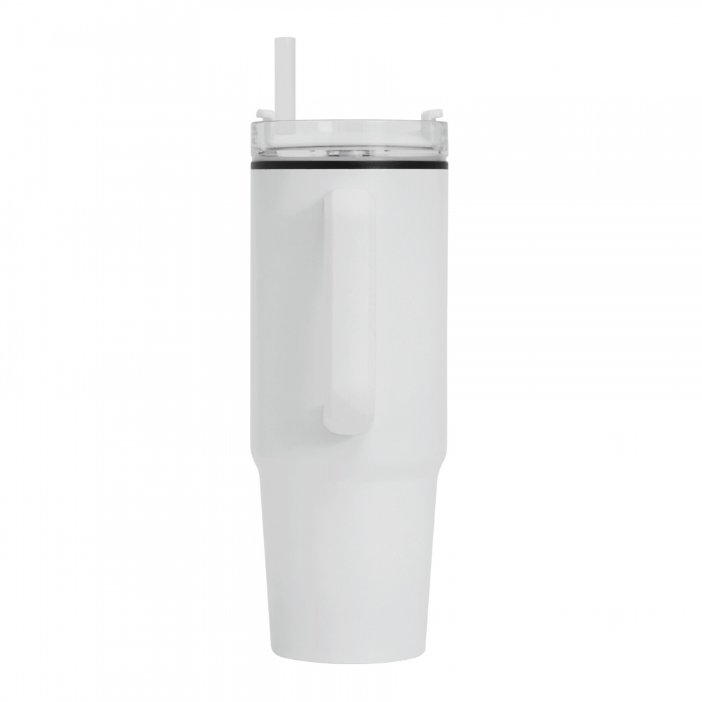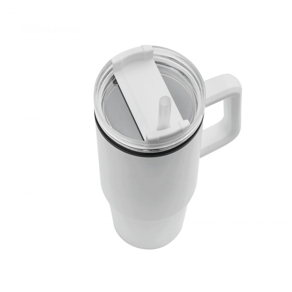 Artikel-Nr: INP56-0304688Trinkbecher DRINK ULTY, doppelwandig: innen aus Kunststoff und außen aus Edelstahl, mit praktischem Griff, transparenter Kunststoff-Deckel mit sicherem Schraubverschluss, Silikon-Dichtring, Trinköffnung mit Drehverschluss und transparentem Strohhalm, beschichteter Boden für gute Oberflächenhaftung, Füllmenge ca. 900 ml, hält ca. 2 Stunden warm und bis zu 4 Stunden kalt, in Box