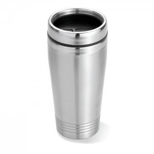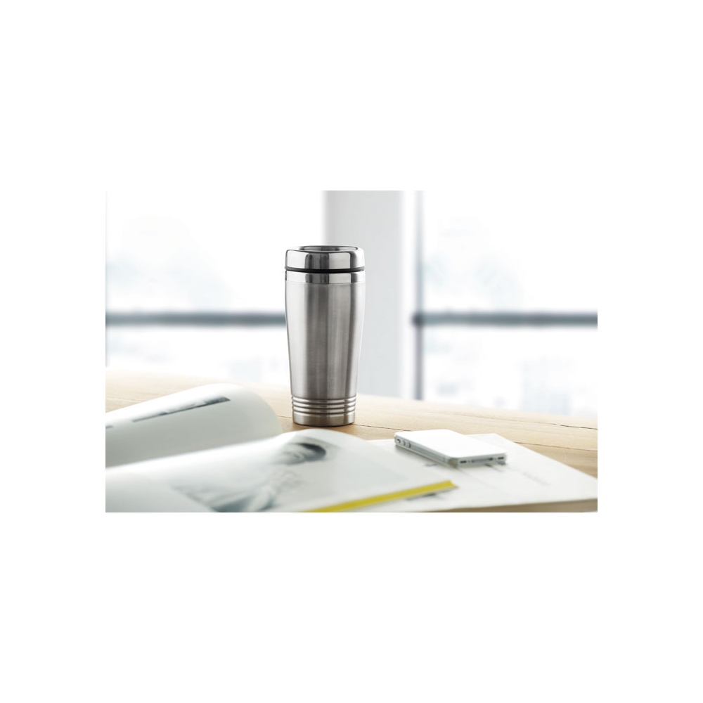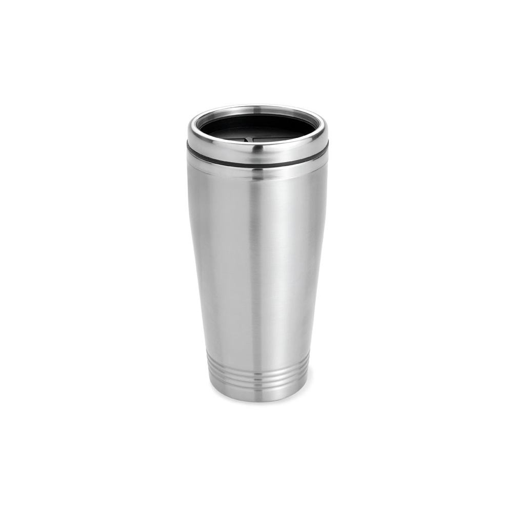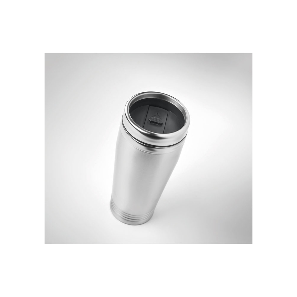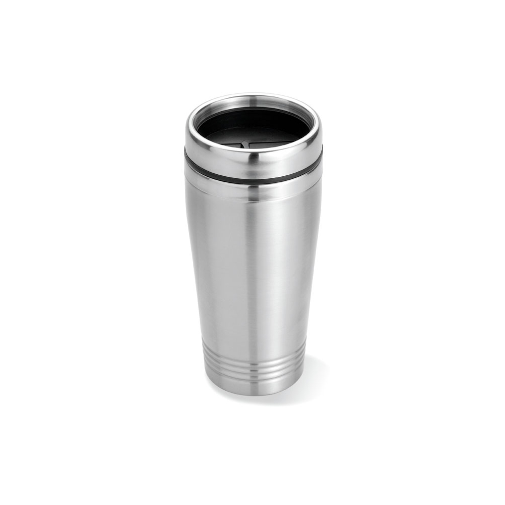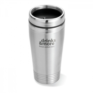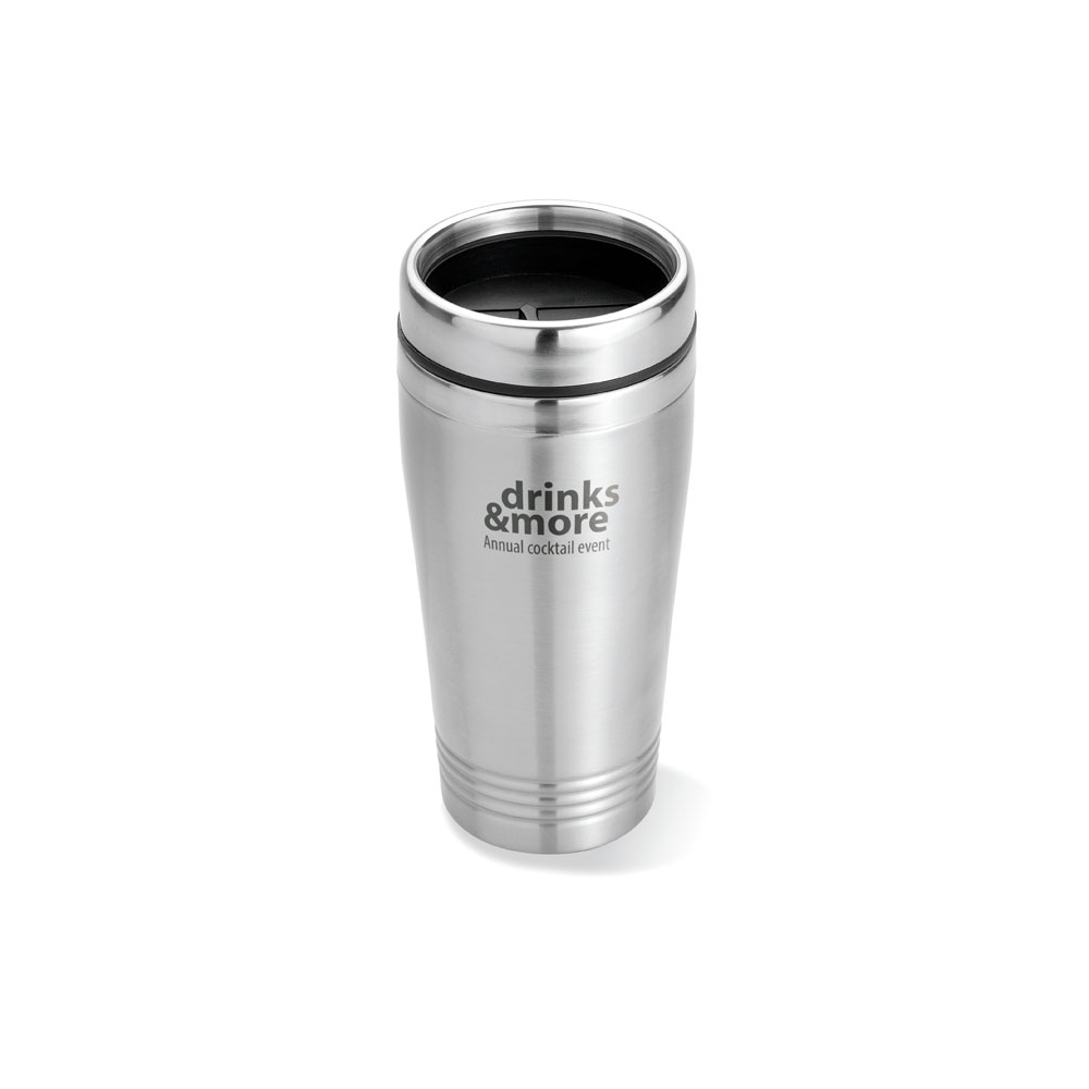 Artikel-Nr: OCBMO8125-16Doppelwandiger Trinkbecher aus Edelstahl mit schwarzen PP Deckel. Füllmenge: 400 ml.