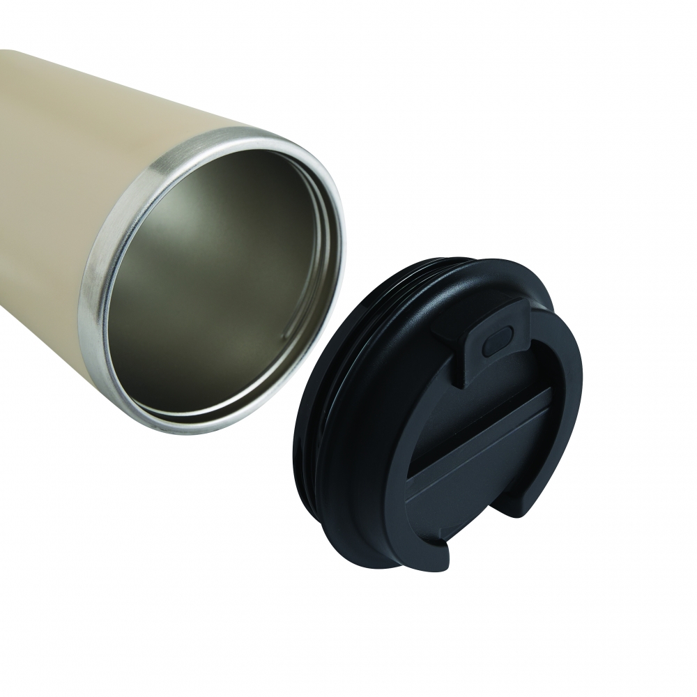 Artikel-Nr: INP56-0304646Trinkbecher TAKE & GO, doppelwandig: innen aus Edelstahl und außen aus Kunststoff, schwarzer Kunststoff-Deckel mit sicherem Schraubverschluss, Silikon-Dichtring und integrierter Trinköffnung zum Aufklappen, beschichteter Boden für gute Oberflächenhaftung, Füllmenge ca. 350 ml, hält ca. 2 Stunden warm und bis zu 4 Stunden kalt