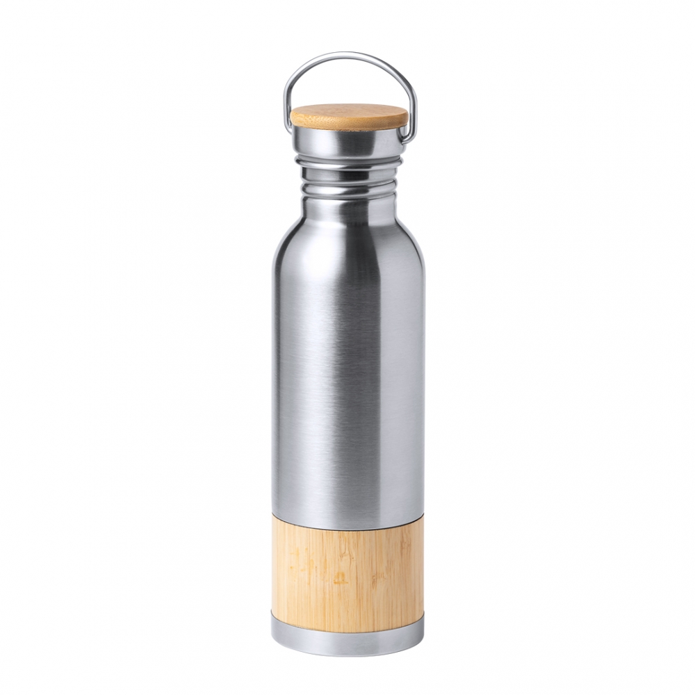 Artikel-Nr: KTO11476009000Flasche mit originellem Retro-Stil und 800 ml Fassungsvermögen. Gehäuse aus Edelstahl mit Bambusband, Schraubdeckel aus Edelstahl und Bambus-Detail. Präsentiert in einer individuellen Box von Öko-Design in Kraftkarton.