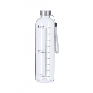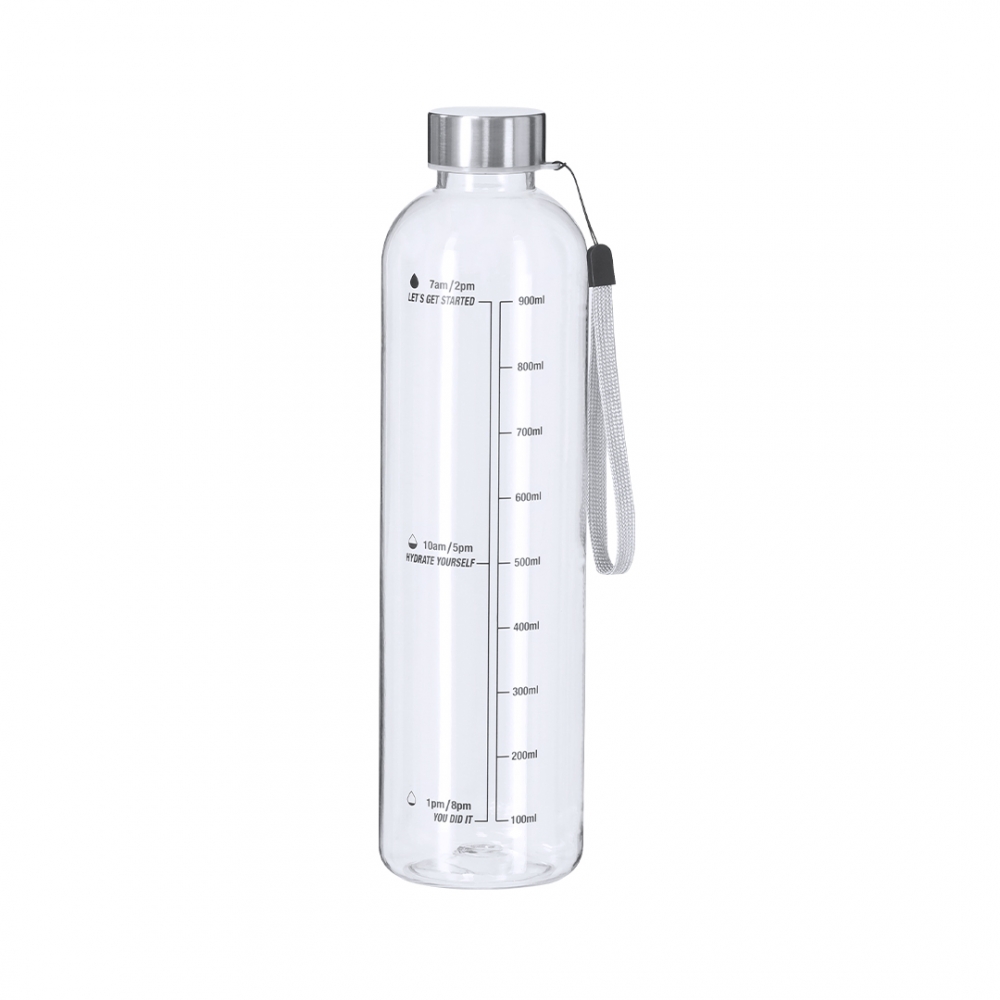 Artikel-Nr: KTO22124216000Flasche aus 1L RPET, entwickelt zur Förderung einer ausreichenden Flüssigkeitszufuhr. Mit durchsichtigem Körper. Enthält eine Kapazitätsanzeige in Litern und Unzen, begleitet von motivierenden Sätzen, die dazu anregen, eine ausreichende tägliche Flüssigkeitszufuhr aufrechtzuerhalten. Die Kappe aus Edelstahl enthält ein praktisches Seil für einfachen Transport. BPA-frei.