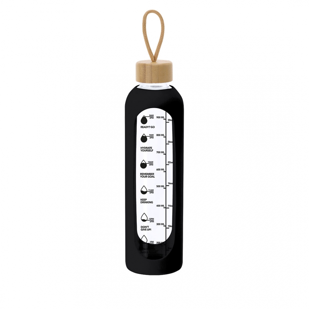 Artikel-Nr: KTO21554002000Flasche aus 1L Glas, entworfen, um eine angemessene Hydration zu fördern. Mit einer Silikonhülle, die schützt und einen bequemen und sicheren Halt bietet. Inklusive Kapazitätsanzeige in Litern und Unzen, begleitet von motivierenden Sätzen, die dazu inspirieren, eine angemessene Hydration täglich aufrechtzuerhalten. Der Deckel, aus Bambus gefertigt, hat eine praktische Kordel für einfachen Transport. BPA-frei.