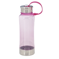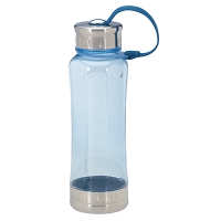 Trinkflasche aus Kunststoff und Edelstahl, mit Nylonriemen für den Deckel und oz- & ml-Anzeige.