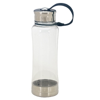 Trinkflasche aus Kunststoff und Edelstahl, mit Nylonriemen für den Deckel und oz- & ml-Anzeige.