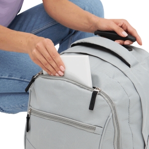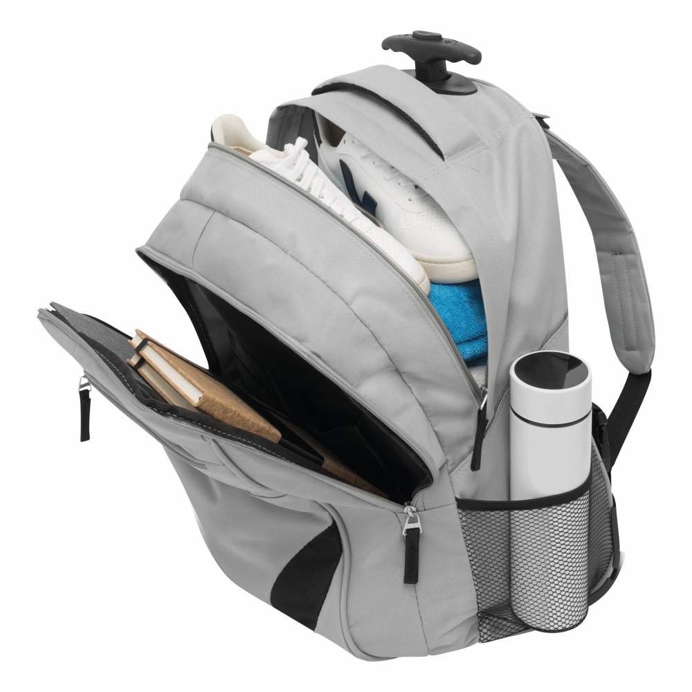 Artikel-Nr: INP56-0219551Trolley-Rucksack TRAILER: kleine Reißverschluss-Vortasche, große Reißverschluss-Vortasche mit Organizer, Reißverschluss-Hauptfach mit gepolstertem Laptopfach, 2 seitliche Netzfächer, gepolsterter Rücken und Schultergurte, Reißverschluss-Fach zum Verstauen der Schultergurte, mit Einhand-Teleskopgestell, Tragegriff, 2 leichtlaufende Skaterrollen inkl. Kleiderschutz