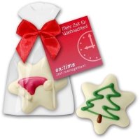 Verpackung: In Glanzbeutel mit bedruckter Karte und roter oder weißer Satinschleife aufgebunden.