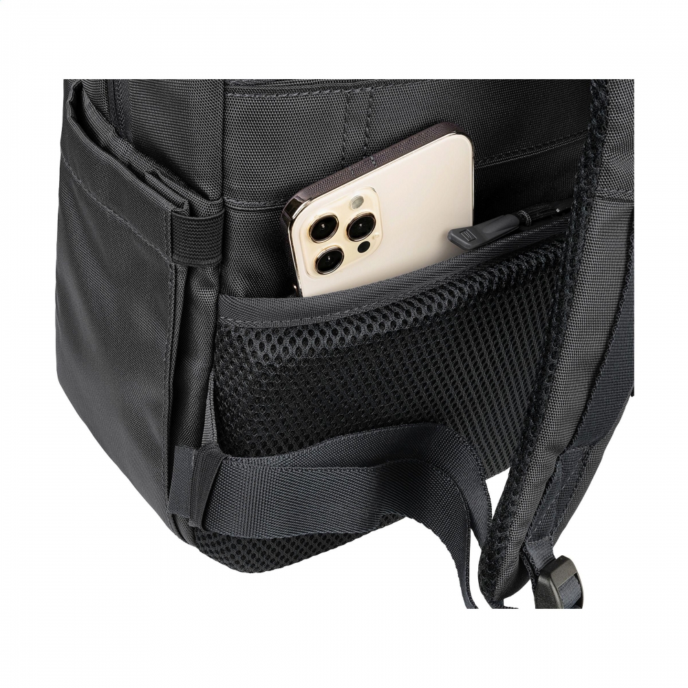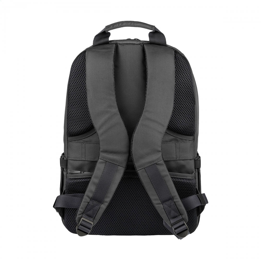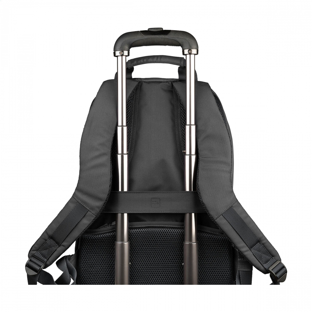 Artikel-Nr: CLP262938-001Eleganter Laptop-Rucksack der italienischen Marke Tucano, hergestellt aus recyceltem Kunststoff, darunter 22 recycelte PET-Flaschen. Das gepolsterte Innere verfügt über 2 Fächer. Ein Fach ist mit einem stoßfesten Fach für Laptops bis zu 15,6 Zoll oder MacBook Pro 16 Zoll und einem Netzfach mit Reißverschluss ausgestattet. Das andere Fach verfügt über ein stoßfestes Fach für ein Tablet und zwei Netz-Einsteckfächer. Mit Reißverschlussfach an der Vorderseite, Seitentaschen für eine Trinkflasche und einen Regenschirm sowie einem praktischen Trolley-Gurt. Komplett gefüttert. Die verstellbaren, gepolsterten Schultergurte und der ergonomische Rücken mit zusätzlichem Reißverschlussfach sorgen für zusätzlichen Tragekomfort. Ein idealer Rucksack für den geschäftlichen Einsatz. Fassungsvermögen ca. 20 Liter.
