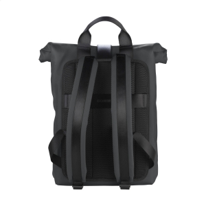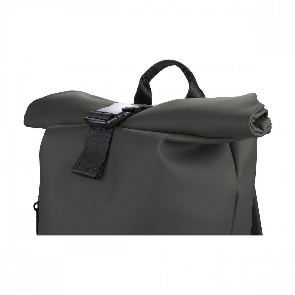 Artikel-Nr: CLP263306-001Sportlicher 'Rolltop'-Rucksack mit robustem Kunststoffverschluss der italienischen Marke Tucano. Hergestellt aus gummiartigen Materialien, die aus recyceltem Kunststoff, darunter 22 recycelte PET-Flaschen, hergestellt werden. Das wasserabweisende Material an der Außenseite ist überraschend geschmeidig und verleiht der Tasche einen eleganten und modernen Look. Ausgestattet mit einem großen Einzelfach mit einem internen, stoßfesten Laptopfach (bis zu 15,6 Zoll oder MacBook Pro 16 Zoll) mit einem Netzfach und einem geräumigen Reißverschlussfach an der Vorderseite für wichtige Accessoires. Komplett gefüttert. Die verstellbaren, gepolsterten Schultergurte und die atmungsaktive Netzrückseite sorgen für zusätzlichen Tragekomfort. Mit Trolley-Gurt und Trageschlaufe. PVC-frei. Ein idealer Rucksack für den täglichen Gebrauch. Fassungsvermögen ca. 22,5 Liter.