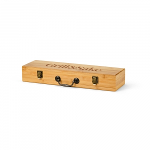 Turner Barbecue-Set aus Bambus. Mit Etui, Zange, Gabel und Spatel