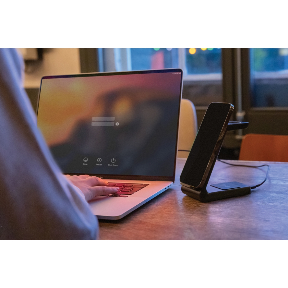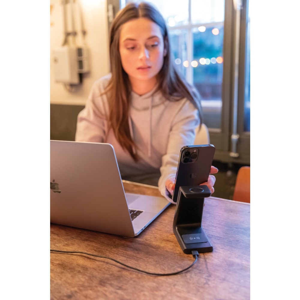 Artikel-Nr: XND308361Kabelloser 15W-3-in-1-Ladeständer aus RCS-zertifiziert (Recycled Claim Standard) recyceltem ABS Gesamter Recyclinganteil: 60% basierend auf dem Gesamtgewicht des Artikels. Die RCS-Zertifizierung gewährleistet eine vollständig zertifizierte Lieferkette der recycelten Materialien. Dieses kabellose Ladegerät lädt Ihr Telefon so schnell wie möglich auf. Das Ladegerät ist mit einer 15W-Wireless-Charging Doppelspule, einer einfachen 5W-Wireless-Charging Spule auf der Rückseite und einem 3W-iWatch-Ladegerät ausgestattet. Inklusive 120cm Type-C Ladekabel aus RCS-zertifiziertem Recycling-TPE. Urban Vitamin Artikel werden ohne PVC hergestellt und sind in plastikreduzierten Verpackungen verpackt. Input: 5V/3A; 9V/2A; 5V/1A; 9V/1,1A
