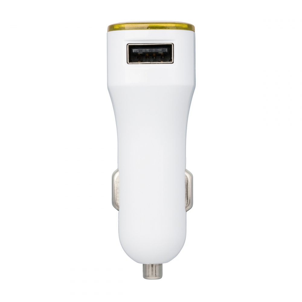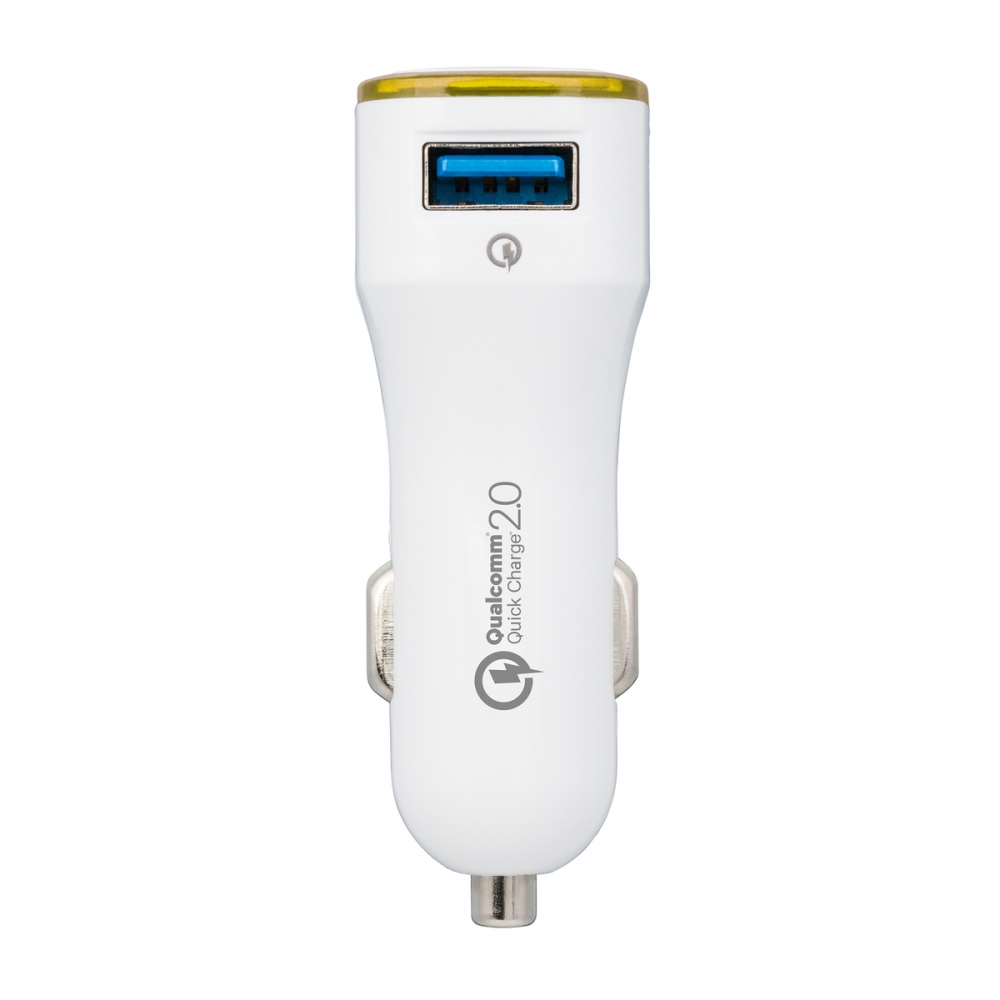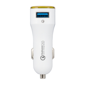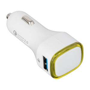 Artikel-Nr: RFS_S_80501-WE-YWDieser Quick charge 2.0-Autoladeadapter hilft, wenn der Akku unterwegs schnell aufgeladen werden muss. Voraussetzung: Ihr Handy ist schnellaufladefähig! Wenn nicht, lädt der Adapter Ihr Gerät dennoch in Standardgeschwindigkeit auf. Output bei zwei Ausgängen - Standardausgang USB DC 5V/1,6A und Quick charge 2.0 mit bis zu DC 5V/2,4A; DC9V/1,7A; DC 12V/1,2 A in Abhängigkeit vom zu ladenden Gerät. Das integrierte Schutzsystem bewahrt vor Überspannung, Überhitzung und Kurzschluss. Der umlaufende Farbring an der Werbefläche wird per LED hinterleuchtet.