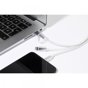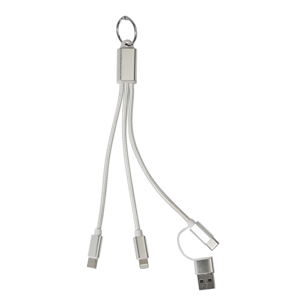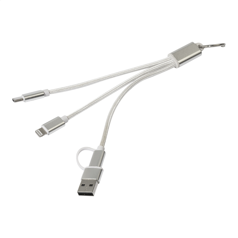 Artikel-Nr: AND864127-21USB-Ladekabel aus recyceltem Aluminium und RPET mit Schlüsselanhänger. Mit USB, USB-C und Lightning Steckern sowie USB und USB-C Adapterstecker.