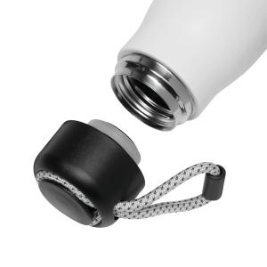 Artikel-Nr: INP56-0304631Vakuum-Isolierflasche ROBUSTA, doppelwandig: außen und innen aus Edelstahl, schwarzer Deckel mit sicherem Schraubverschluss und dekorativer Trageschlaufe, Füllmenge: ca. 500 ml, hält ca. 8 Stunden warm und bis zu 12 Stunden kalt