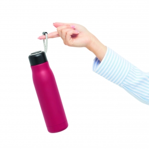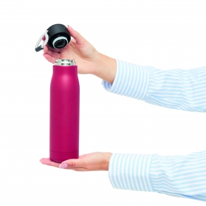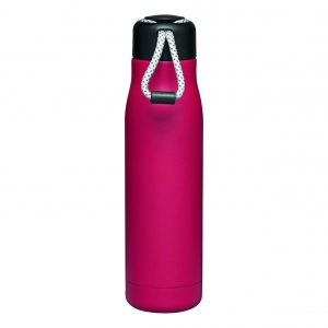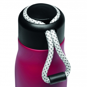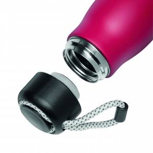 Artikel-Nr: INP56-0304633Vakuum-Isolierflasche ROBUSTA, doppelwandig: außen und innen aus Edelstahl, schwarzer Deckel mit sicherem Schraubverschluss und dekorativer Trageschlaufe, Füllmenge: ca. 500 ml, hält ca. 8 Stunden warm und bis zu 12 Stunden kalt