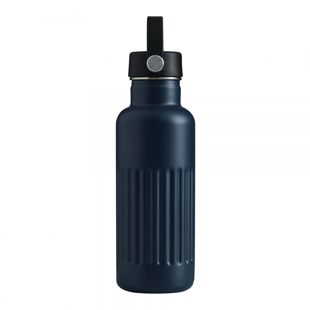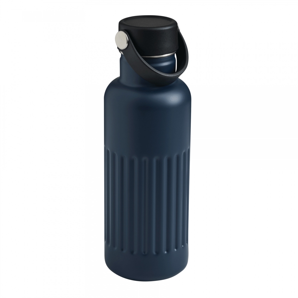 Artikel-Nr: INP56-0304719Vakuum-Isolierflasche WAVE TRAIL, doppelwandig: innen aus recyceltem Edelstahl und außen aus Edelstahl, schwarzer Kunststoff-Deckel mit sicherem Schraubverschluss, Silikon-Dichtring und Kunststoff-Trageschlaufe, Füllmenge ca. 500 ml, hält ca. 8 Stunden warm und bis zu 12 Stunden kalt, in Box
