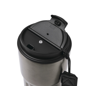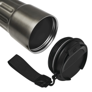 Artikel-Nr: INP56-0304559Vakuum-Isolierbecher TRAVEL MUG, doppelwandig: innen und außen aus Edelstahl, Kunststoffdeckel mit sicherem Schraubverschluss, Silikondichtung und integrierter Trinköffnung, Füllmenge ca. 400 ml, mit Handschlaufe aus recyceltem Kunststoff